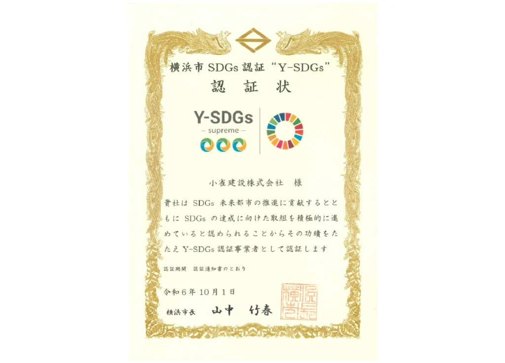 小雀建設は、横浜市が推進するSDGs認証制度「Y-SDGs」において、最上位ランク「Supreme」の認証を取得しています。この認証は、環境・社会・経済の三側面で優れた取り組みを行う企業に与えられるもの。持続可能な地域社会の実現に向けた私たちの姿勢が、評価されています。