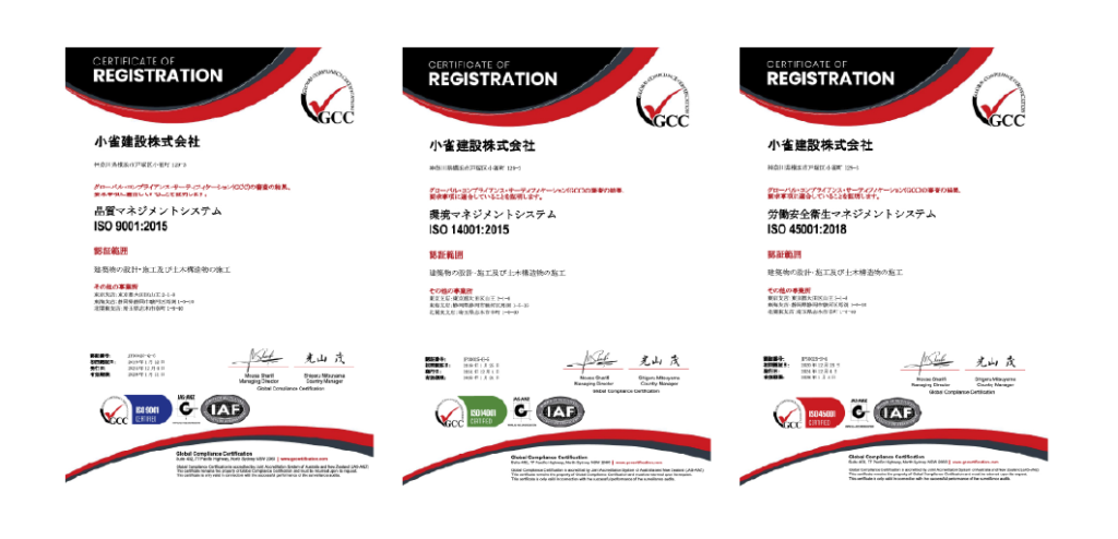 小雀建設は、ISO9001(品質)、ISO14001(環境)、ISO45001(労働安全衛生)の三大マネジメントシステムを統合的に運用しています。これは単なる認証取得ではなく、高品質な施工、環境への配慮、安全な職場を同時に実現するための仕組みです。